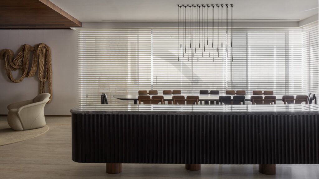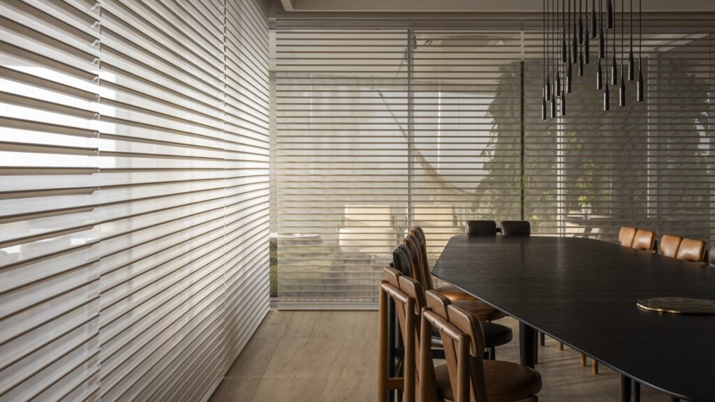 As soluções da Uniflex foram pensadas desde o início da obra, como parte estrutural da arquitetura. Na varanda, por exemplo, onde o sol poente incide com força, as cortinas garantem conforto térmico e protegem os materiais sem comprometer a vista. Em outro ambiente, foram aplicadas de forma tão integrada ao painel ripado que se tornam praticamente invisíveis.