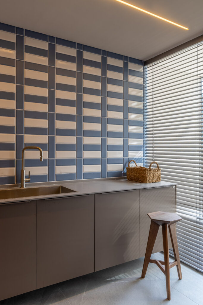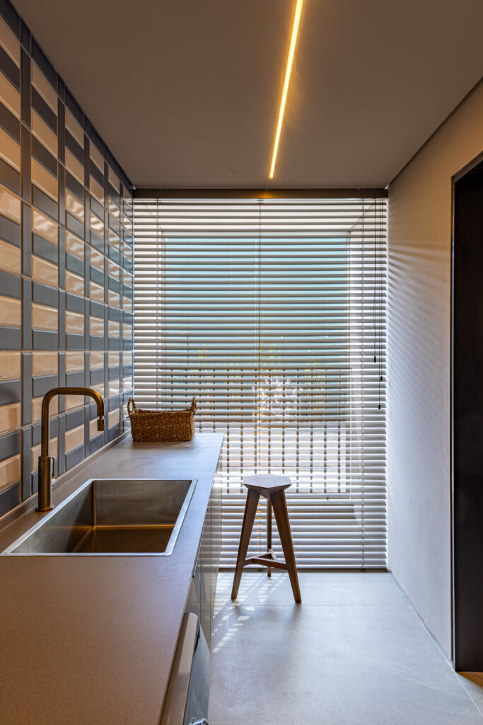 Na lavanderia, a Persiana de Alumínio trouxe leveza visual e precisão. Suas lâminas horizontais, disponíveis em diferentes larguras e mais de 80 cores, oferecem liberdade de composição e controle exato da luminosidade.