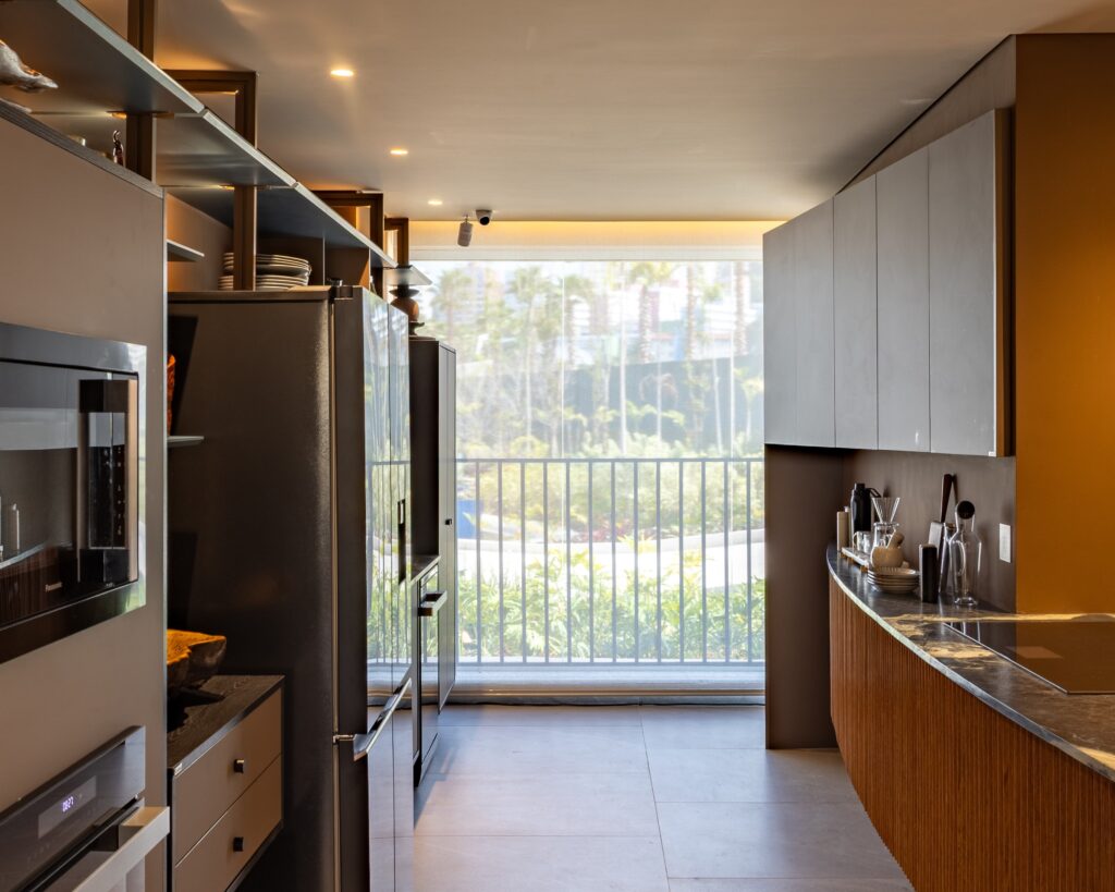Na cozinha, a Cortina Rolô Balcony trouxe leveza e transparência. Criada para grandes janelas e varandas, ela filtra o sol sem bloquear a vista. O tecido técnico de alta performance reduz o calor e mantém a luminosidade natural, criando um ambiente fresco e agradável.