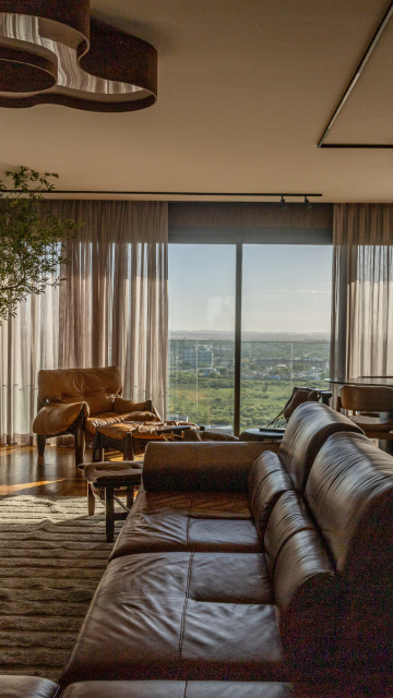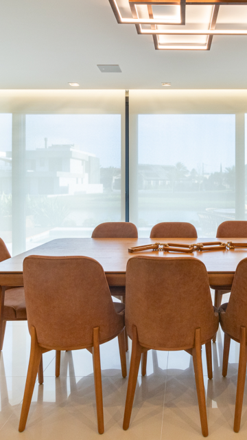 Cortinas de tecido e rolos em tela solar, unindo conforto visual, elegância e controle de luminosidade.