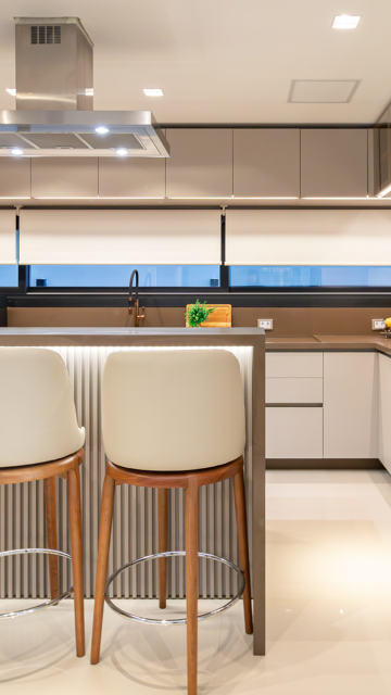 Ambiente valorizado pelo design funcional das cortinas rolô, unindo praticidade e sofisticação.